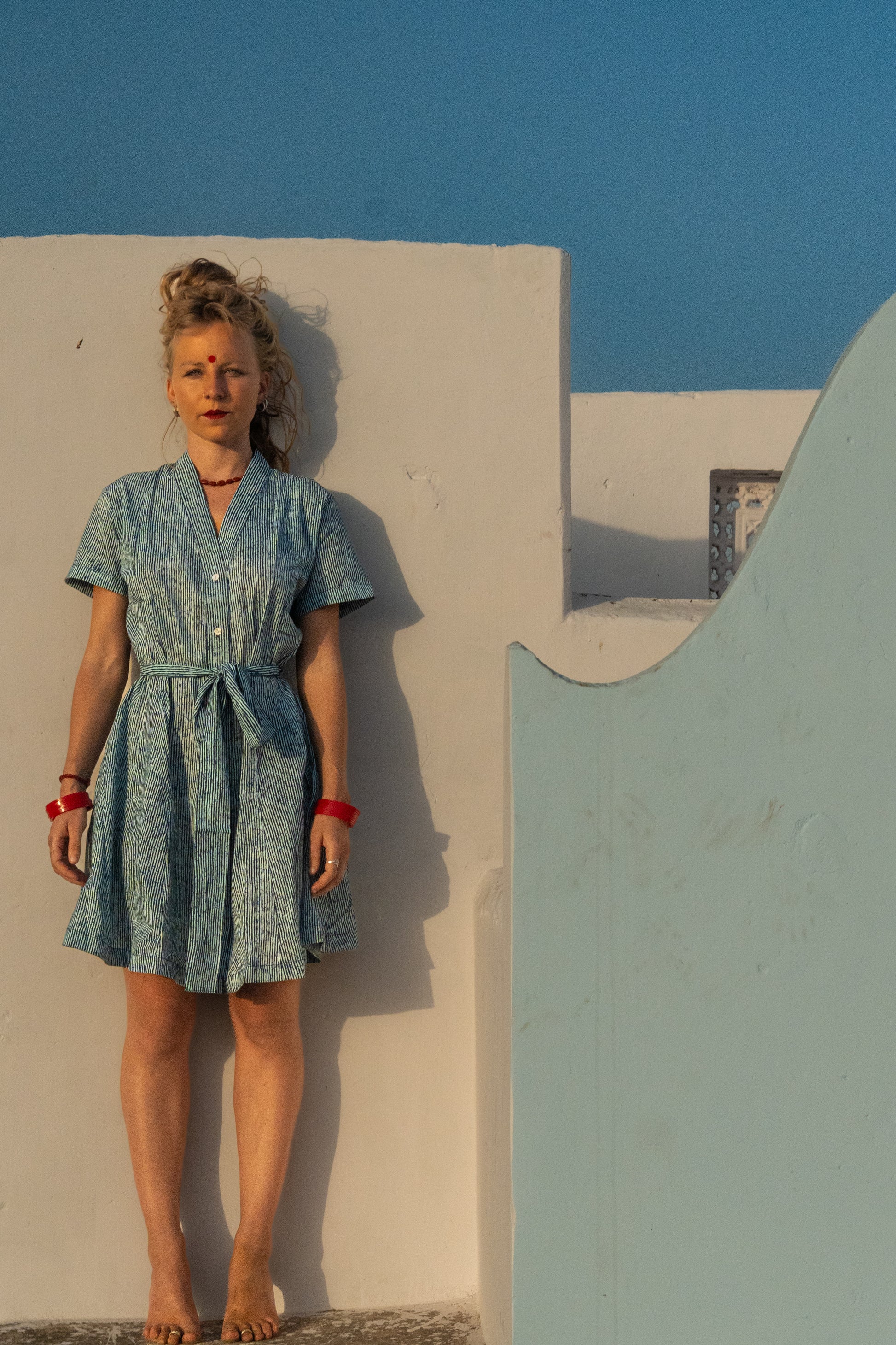 Une robe légère et élégante en coton fin, avec une coupe courte, une ceinture ajustable et des poches invisibles pour allier confort et féminité.