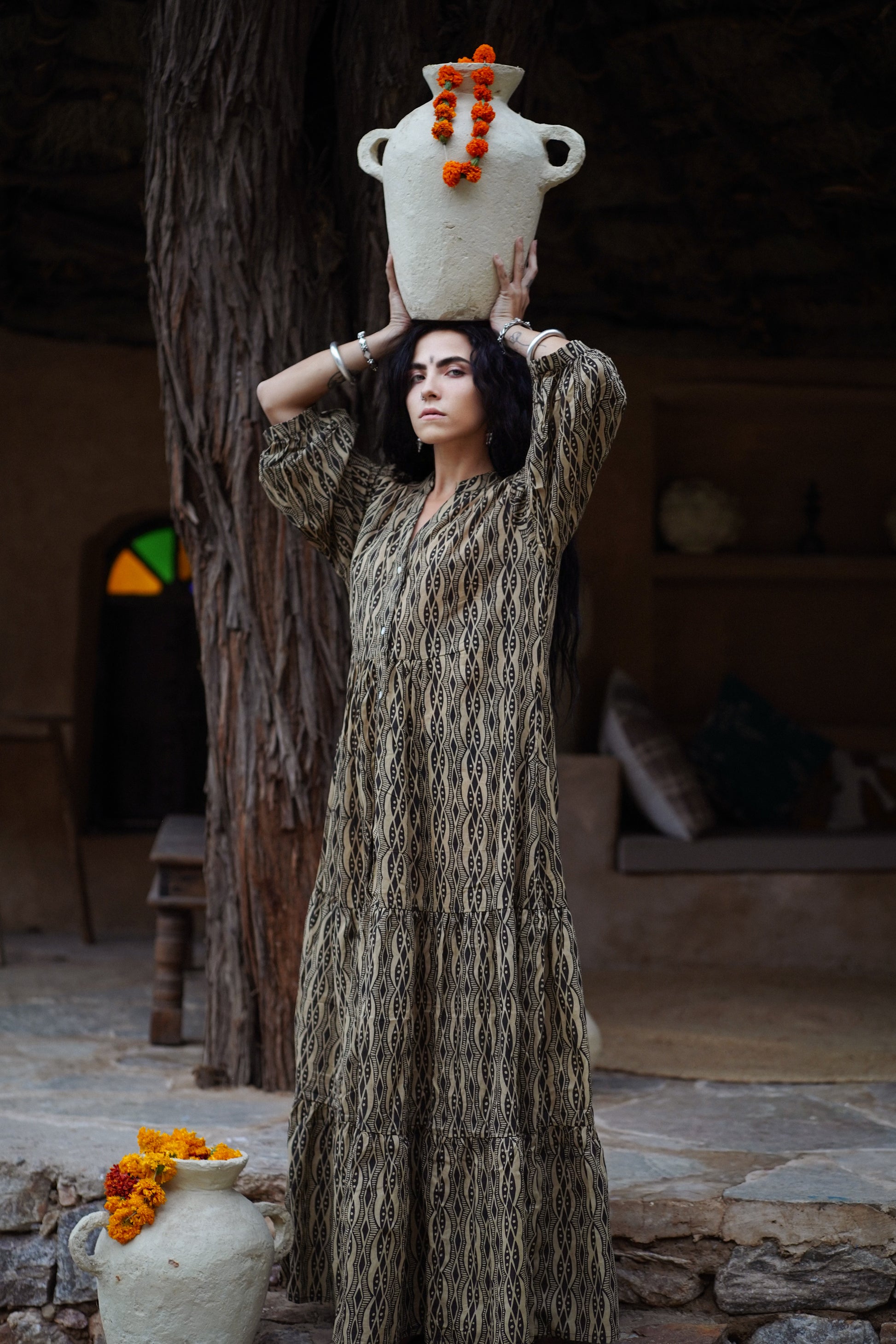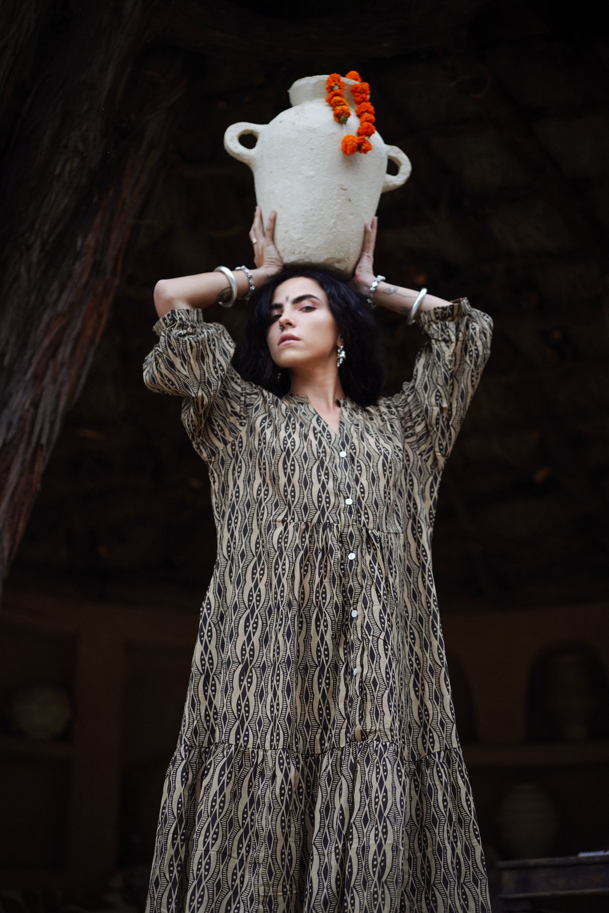 Une robe fluide et élégante en coton fin, avec des manches mi-longues et des volants délicats pour une allure bohème-chic.